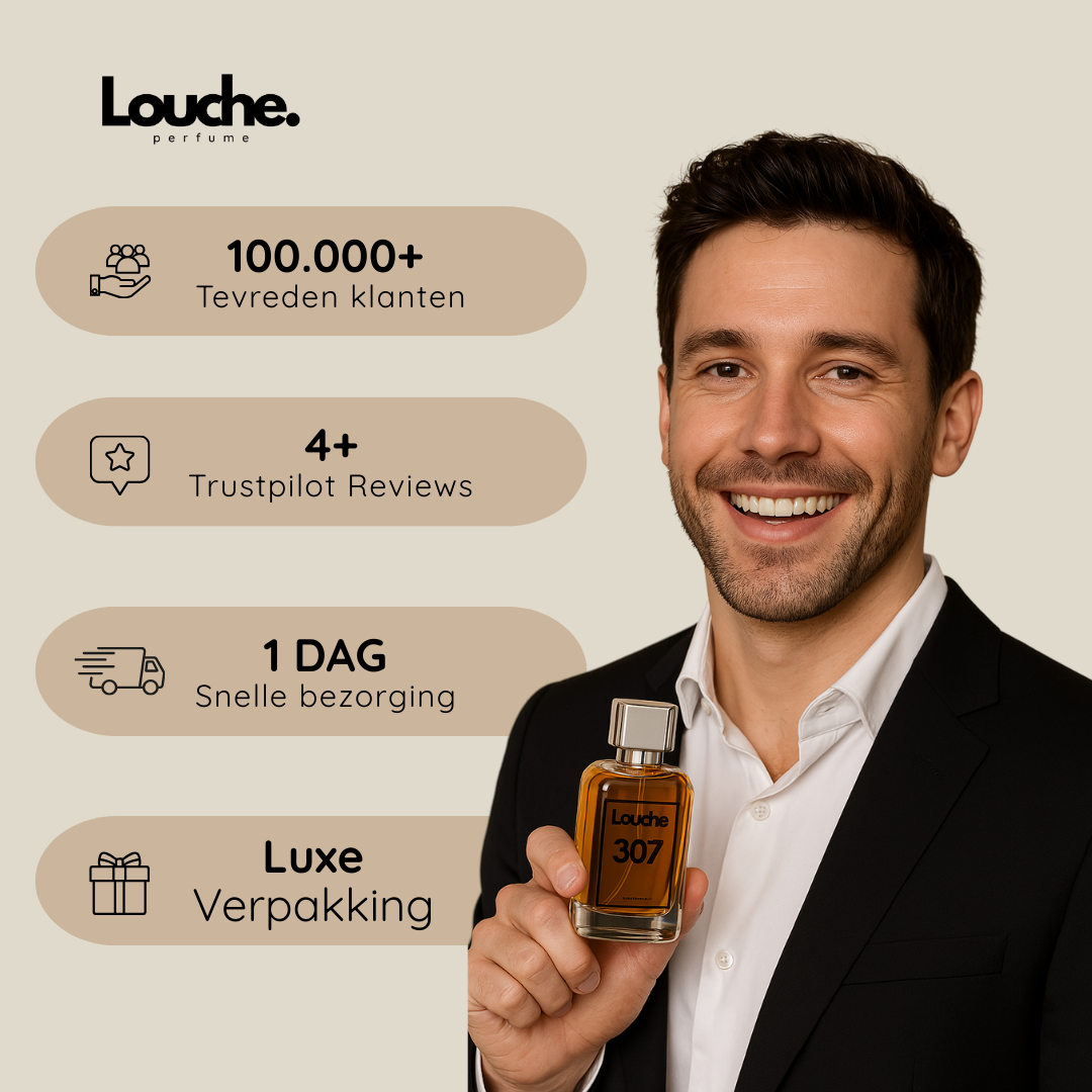 Let op: Onze parfums zijn geïnspireerd op de geurnoten van bekende geuren, maar zijn geen exacte kopieën, replica’s of vervangingen voor de originele designerparfums. Louche Perfume staat volledig los van deze merken en heeft geen enkele samenwerking of goedkeuring van hun fabrikanten. Merknamen, auteursrechten en handelsmerken zijn eigendom van hun respectieve eigenaren en behoren niet aan ons toe. Vermelde productnamen dienen uitsluitend ter referentie en impliceren geen enkele verbondenheid met de merkeigenaren.